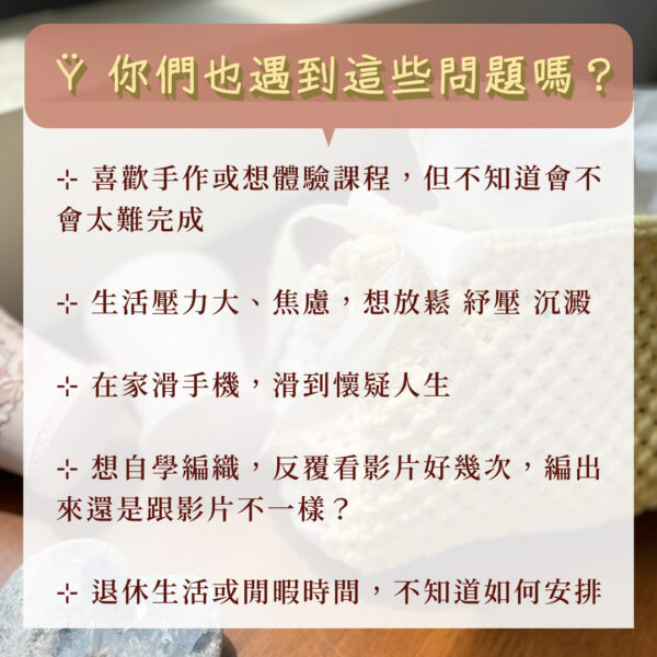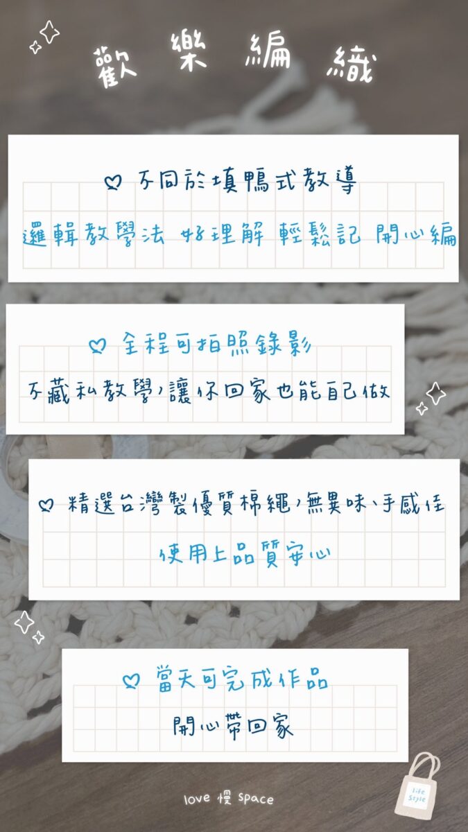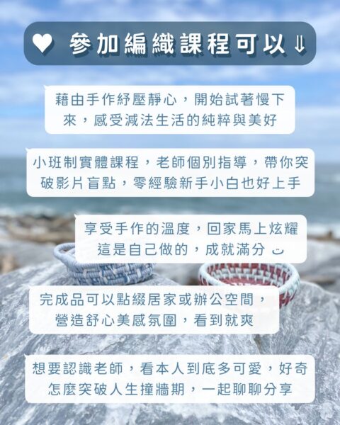 ◌ ✵ ⁎ * ◌ ✵ ⁎ * ◌ ✵ ⁎ * ◌ ✵ 藝術是我的防空洞 用創作來擁抱自己透過手作教學 日常創作 讓彼此心中柔軟的旅程這堂課除了編織 也是在繁華生活中給予自己紓壓留白的me time ت 課 程 報 名 & 訂 購 優惠 初階 ♡ { 小愛心萬用墊 } 鑽石閃心心 NT$1,800 原始價格:NT$1,800。NT$1,500目前價格:NT$1,500。 花蓮課程 優惠 初階 ♡ { 大愛心萬用墊 } 對你愛不完 NT$2,180 原始價格:NT$2,180。NT$1,800目前價格:NT$1,800。 花蓮課程 優惠 初階 ♡ { 裝進美好生活的籃子 } NT$2,600 原始價格:NT$2,600。NT$2,300目前價格:NT$2,300。 花蓮課程 優惠 初階 { 🐾 編織手機腕繩/鑰匙圈 } NT$1,600 原始價格:NT$1,600。NT$1,400目前價格:NT$1,400。 花蓮課程 優惠 初階 { 任你裝 彈片口金包 } NT$2,580 原始價格:NT$2,580。NT$2,200目前價格:NT$2,200。 花蓮課程 優惠 初階 { 南瓜小夜燈 } NT$1,500 原始價格:NT$1,500。NT$1,350目前價格:NT$1,350。 花蓮課程 優惠 初階 { 南瓜小夜燈 } NT$1,250 原始價格:NT$1,250。NT$1,100目前價格:NT$1,100。 台中課程 優惠 限量⟡ 手提/肩背編織格紋包 ⟡ NT$3,680 原始價格:NT$3,680。NT$2,980目前價格:NT$2,980。 作品訂購 優惠 初階 { 任你裝 彈片口金包 } NT$2,380 原始價格:NT$2,380。NT$1,980目前價格:NT$1,980。 台中課程 優惠 初階 { 🐾 編織手機腕繩/鑰匙圈 } NT$1,350 原始價格:NT$1,350。NT$1,150目前價格:NT$1,150。 台中課程 優惠 進階 { ☀️Sun 光芒之星 } NT$2,280 原始價格:NT$2,280。NT$1,980目前價格:NT$1,980。 台中課程 優惠 初階 { 編織飲料/水壺提袋 } NT$1,250 原始價格:NT$1,250。NT$1,150目前價格:NT$1,150。 台中課程 學 生 回 饋 關於可愛的老師 本身就喜歡手作藝術,2020年在一次的重大低潮中,接觸到macrame 編織, 學到等待 放慢步調 慢慢放下完美主義,感到靜心 紓解情緒 成為解壓出口, 慢慢開始設計創作,從教學過程中,學生也是我的老師,得到很多反饋🫶🏻 2023年離開高壓的醫療環境職業,放棄世人眼中的穩定 稱羨的工作🤪踏出舒適圈~ 創業的過程中,感恩遇到很多貴人幫忙,自己也摸索 發展許多無限可能… 不論你們在課堂上為何而來,或額外獲得意想不到的收穫,我都很開心有幫助到你們🫶🏻 📄 相關證照: • 英國劍橋國際學院macrame進階證照 👩🏫 機構團體編織課經歷: • 嘉義立人高中 學生團體課 • 彰化埔心鄉農會 長者團體課 • 台北市毒品危害防治中心兒童夏令營 • 振宇五金總部員工團體課 • 桃園特殊教育學校教師研習活動 • 彰化大村 村內一家團體課 • 彰化線西國中教師研習活動 • 新竹豐邑建設社區團體課